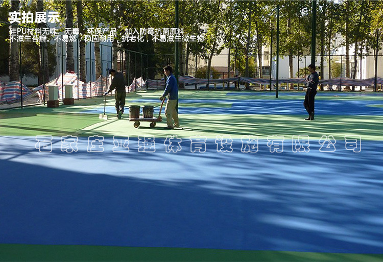 塑膠球場PU面層是由塑膠材料于現(xiàn)場混合鋪設(shè)、流平固化后形成的無接縫彩色彈性體,廣泛用于室內(nèi)外籃球場、網(wǎng)球場、