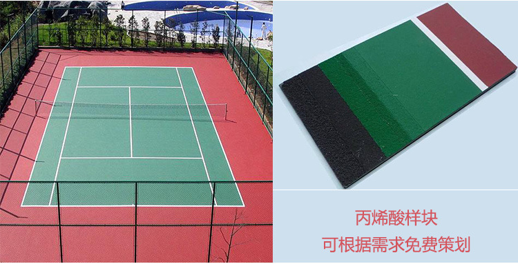 容易,價(jià)格適中,維修及維護(hù)方便。 適用范圍: 適用于室內(nèi)外丙烯酸籃球場(chǎng)、 丙烯酸網(wǎng)球場(chǎng)、 丙烯酸排球場(chǎng)、 丙烯酸羽毛球場(chǎng)等, 還可做成彩色地坪,美化環(huán)境。