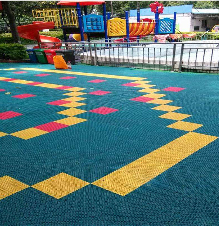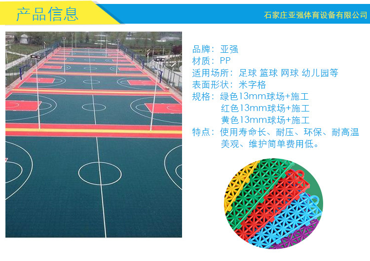 6.安全防護:全眾懸浮式拼裝地板特有的專利設計(拼裝地板底部跟支撐柱支撐,拱形排水槽,邊緣采用公扣母扣銜接)很好