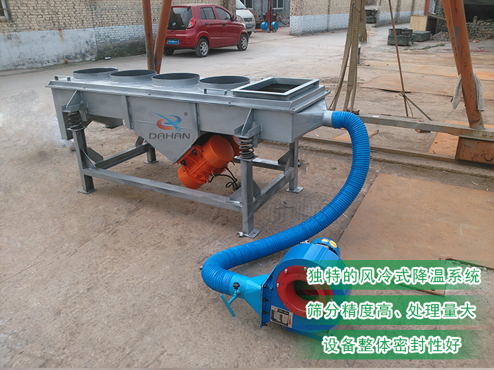 風冷式直線振動篩在進料口底部或箱體下側端增加了風機降溫冷卻系統(tǒng),在進料口加裝篩網及小型排料口使大顆粒結塊物料從小型排料口中排出,該裝置可有效攔截大顆粒并緩沖物料對篩網的沖擊,延長篩網使用壽命,在物料在進入設備時,位于進料口底部或箱體下側端的風機降溫冷卻系統(tǒng)對其進行降溫作業(yè),在激振力和物料自重力的合理作用下,降溫后的物料在篩面上被拋起、跳躍式向前做直線運動,通過多層篩網過濾不同規(guī)格的篩上物及篩下物,分別從各層的出料口排出,達到篩選和分級的目的。