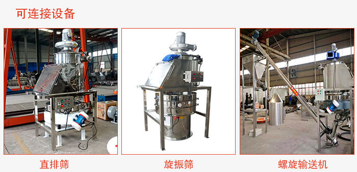 無塵投料站實現無塵投料、上料,解決粉塵飛揚問題:利用高壓氣管向內打氣使投料室的布袋膨脹,再利用集塵風機抽取吸附在布袋表面上的灰塵,從而實現對飛塵的吸附。可根據需求配合振動篩分設備,輸送設備,以及其它的工藝設備進行使用。