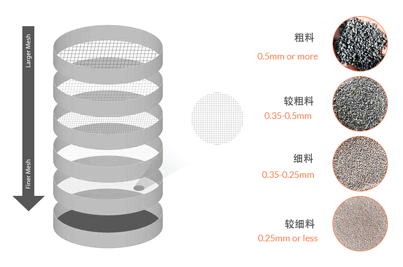 人工手篩費(fèi)時(shí),勞動(dòng)強(qiáng)度大,"機(jī)械篩分"將篩子按孔徑大小疊在一起,給料放在上面一層篩子上,并加上蓋和底盤,一般疊5-6個(gè)篩子,然后放在實(shí)驗(yàn)室振動(dòng)篩上進(jìn)行機(jī)械振動(dòng)篩分。通常振動(dòng)時(shí)間為20分鐘,檢測(cè)篩分質(zhì)量時(shí),再用篩機(jī)5分鐘,如每分鐘篩下量小0.2%試驗(yàn)樣量即為合格,對(duì)于粗粒,過篩率小于1%即可。為避免損失和延長(zhǎng)篩分時(shí)間,有時(shí)在開始篩分時(shí)先用較細(xì)的篩子將粉塵篩除。