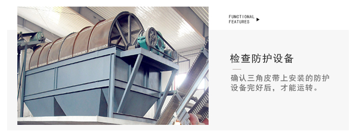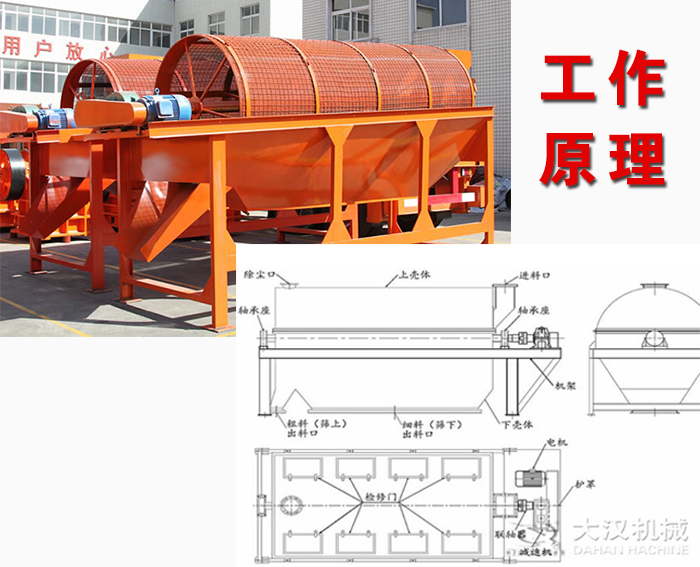滾筒篩篩沙機主要由電機、減速機、滾筒裝置、機架、密封蓋、進料口、出料口等部分組成。滾筒裝置傾斜安裝于機架上。電動機經(jīng)減速機與滾筒裝置通過聯(lián)軸器連接在一起,驅(qū)動滾筒裝置繞其軸線轉(zhuǎn)動。當(dāng)物料進入滾筒裝置后,由于滾筒裝置的傾斜與轉(zhuǎn)動,使篩面上的物料翻轉(zhuǎn)與滾動,使合格物料(篩下產(chǎn)品)經(jīng)滾筒后端底部的出料口排出,不合格的物料(篩上產(chǎn)品)經(jīng)滾筒尾部的排料口排出。由于物料在滾筒內(nèi)的翻轉(zhuǎn)、滾動,使卡在篩孔中的物料可被彈出,防止篩孔堵塞。