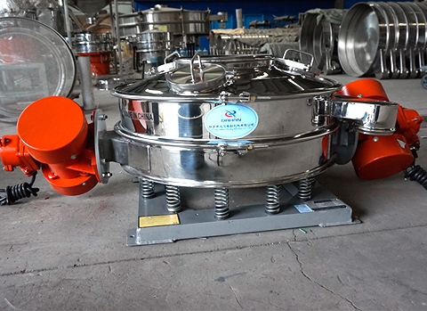 直排篩利用振動(dòng)電機(jī)利用其軸上下端的兩組偏心塊(不平衡偏心塊)的相位角以及兩臺(tái)電機(jī)之間的交叉角度將振動(dòng)電機(jī)的旋轉(zhuǎn)運(yùn)動(dòng)變?yōu)樗?、垂直、傾斜以及離心作用的多作用力重疊,再將這種作用力傳遞給篩面,從而達(dá)到篩分的目的。改變上下偏心塊的相位角和重量,可以改變激振力的大小和物料的運(yùn)動(dòng)軌跡。